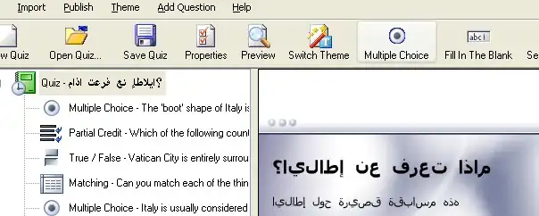 The example given below shows part of the front page of the Italian quiz sample with arabic script. The resulting quiz shows the script characters in their standalone form, which makes reading much slower. If you attempt this workaround, you will also have to make sure that you do not use any question types which require a written answer (fill in the blank or essay types).