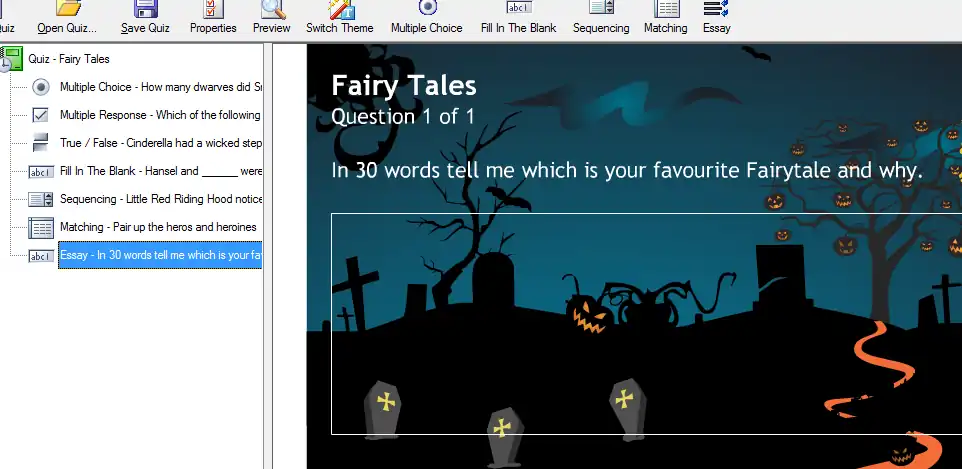 Both the Standard and Professional version of Question Writer come with a range of themes. To add or change the theme of your quiz you just select Theme from the menu bar or click the Switch Themes button. A list of themes will appear and you can select whatever seems appropriate to you. If you double click on the theme a dialogue box will appear telling you that the theme has been changed.