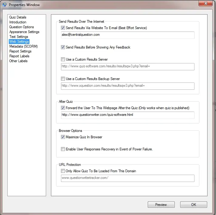 The Web Settings Properties box allows you to define how the quiz acts when it is viewed online.