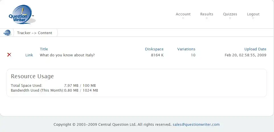 On the Quizzes page you will be able to see all the quizzes you have uploaded to Tracker along with information about how much of your free space you have used. You can copy the link for any of your published quizzes, use the link to go to the quiz or remove the quiz by clicking on the red cross beside it.