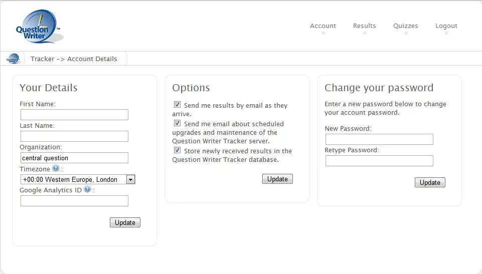 In the Accounts page you can add details about yourself (including your Google Analytics ID) and edit how you are contacted by Question Writer Tracker. If you tick the box to receive results by email this will overwrite the settings in the individual quizzes.