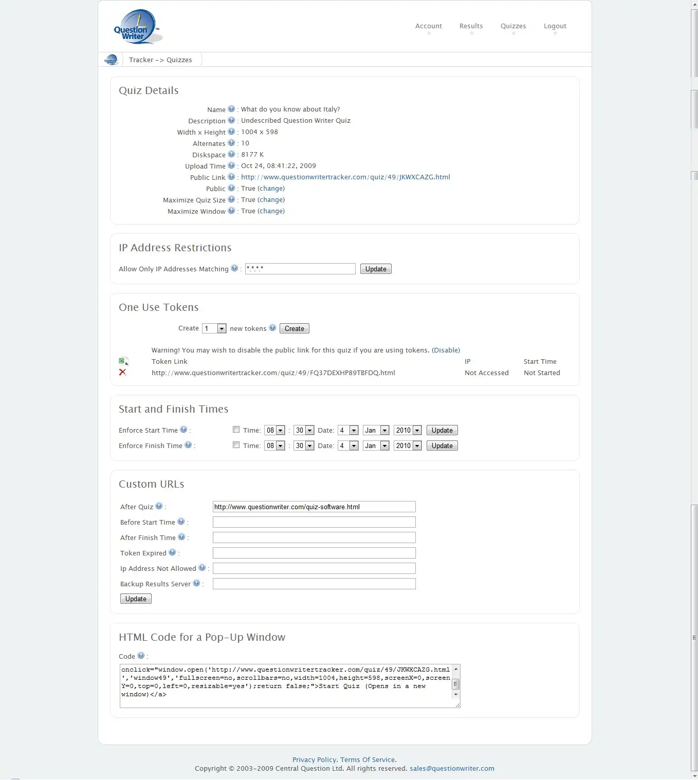 This page is where you can set your user tokens, create start and end dates for the quiz or limit access to certain IP Address as well as adding your own custom URLs and copy the HTML code for creating a pop-up window. There is more detail about these features in this manual.