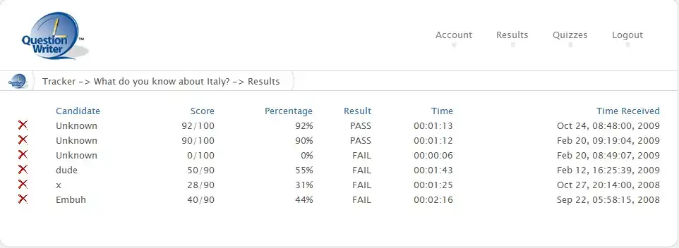 You can delete a quiz by clicking on the red cross beside the name, or you can click on the white question mark in the dark blue circle and see a list of all the questions in that quiz along with some statistics on the scoring for that question.
