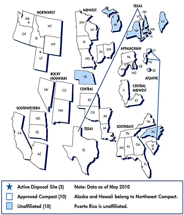 The Low-level Radioactive Waste Policy Amendments Act of 1985 gave the states responsibility for the disposal of their low-level radioactive waste. The Act encouraged the states to enter into compacts that would allow them to dispose of waste at a common disposal facility. Most states have entered into compacts; however, no new disposal facilities have been built since the Act was passed.