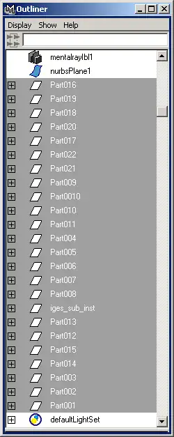 - Now select all the geometry from your model by opening the Outliner (Window > Outliner...), selecting the first group of geometry and SHIFT selecting the last group: