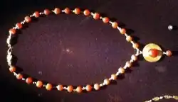 The top necklace on the right is from between the 1st century B.C.E. to the 1st century C.E. It is made of carnelian and gold. The carnelian