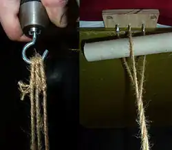 - Twist the rope "backwards". It will first stretch and then shrink again. Shrink it until about 10 cm before your hook-board.