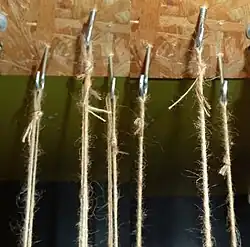 - Measure your yarns and put them on n (= number of future strands, probably 3) hooks on both sides. Your rope will be significantly shorter than the initial yarns. At some point your strands will break if you twist them too much, but until then it is up to your taste how much and which way around you want to have your rope twisted. The best way to find out is by making a short sample. If you really have no clue, test 80%.
