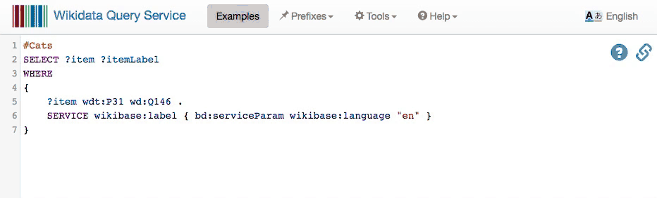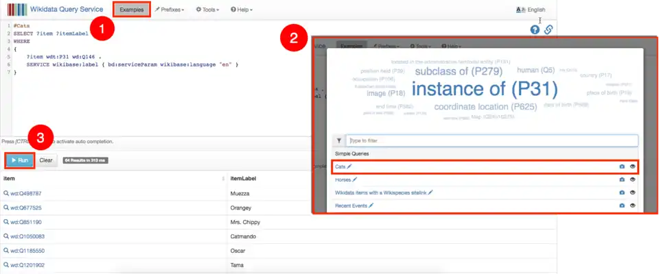 #defaultView:ImageGridWhat looks like a comment, is actually an instruction to display the query result as images instead of a table.?x1This means that we query for any predicate, not only for “is an instance of”. Think of predicates like “depicts” (P180) or “is named after” (P138). We are not using ?x1 anywhere else in the query, meaning the placeholder stands for “I don’t care what the predicate is, give me all results that somehow have a cat as the subject”OPTIONALInside the curly braces you see another statement that adds optional data to the result. The placeholder ?item is reused and coupled with the predicate P18 (meaning “(has) image” and a new placeholder ?pic. Wrapping the statement with OPTIONAL means that items do not necessarily have to have a P18 predicate to show up in the list and that the ?pic placeholder can be empty.