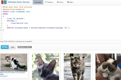 Click the “Examples” button and select the “Even more cats, with pictures” example. Run the query and cat images should pop up at the lower half of the screen.#