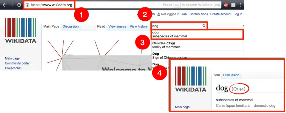 - Take note of the item number for “dog” from the Wikidata page that opens (Q144)