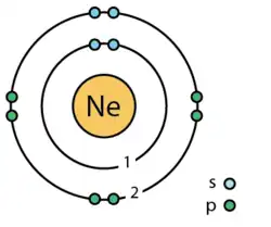 Some atoms will not combine with any other atoms--they are completely non-reactive. They can be found in the far right column of the periodic table and are called noble gases. Their personality is "prideful" and "stuck up," and they refuse to play with anyone and will never share. The reason they are non-reactive is that their outer (valence) shell of electrons is completely full. Helium is the first in that column and has just 2 electrons, which perfectly fills the first electron shell. Next down is Neon--it has 10 electrons, which is 2 plus 8--again, the outer shell is naturally all the way full. All other atoms "wish" they could be like their "noble" cousins. They will react in some way that will bring them closer to having their own outer shells full. For some, the quickest way to complete the outer shell is by getting rid of an electron or two (if your outer shell just has 1 electron and you donate that to another atom, then that shell just disappears and the full shell beneath is now the outer shell), and for others they need to add an electron or two. If your first shell has 2 electrons and your second shell has 8 electrons, and your next shell has 7 electrons (Chlorine, Cl), then you desperately want one more electron so you can be like your noble next-door neighbor Argon. On the other hand, if your first shell has 2 electrons, your second shell has 8 electrons, and your third shell has 1 electron (Sodium, Na), then you desperately want to get rid of 1 electron (which would leave you looking like the noble gas Neon). In their pure state both Chlorine and Sodium are dangerously reactive, but once they have found each other and sodium has given its electron away to chlorine then both are incredibly stable and nonreactive. This exchanging of an electron is discussed further under Ionic bonding. If, in order to get to a full outer shell, you need 2 or 3 or 4 electrons then it is easier to share electrons with others, which will be discussed under covalent bonding.