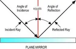 Reflection is energy waves bouncing off the surface of an object. Reflected light always leaves the reflecting surface at the same angle as it strikes the surface. Angle of incidence = angle of reflection. For example, you can picture a ball bouncing. If one drops a ball straight down it will bounce straight back up. If you bounce it at an angle it will bounce up in a angle. In a elementary school you might see this come in effect during their play time as boys and girls bounce balls.