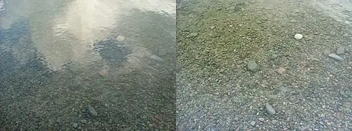 When a person looks at large body of water like the sea or beach what you are really looking at is a reflection of the blue sky, rather than the color of the color of the water itself. In fact water molecules absorb red light the red is removed by the water, and the complementary color of red. The end result is the blue-green color we might see in lakes or rivers.