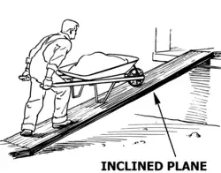 An inclined plane is a slope or slanting surface used to connect a lower level with a higher level. An inclined plane will help reduce work, but it will increase in distance.