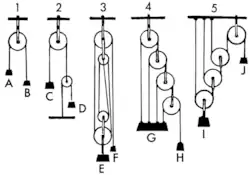 In the figure to the right, there are two freely rotating pulleys , one is on the upper block, which remains fixed, and one is on the lower block, which moves up as the load is lifted; one end of the rope is anchored to the upper block