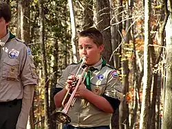 | Taps: | Taps is played to indicate it's "light's out" and time for bed. Scouts often use it at the close of a camp or campfire. Taps has also evolved to be played at dusk, during flag ceremonies, and congress has designated that all veterans are entitled to a bugler at their funerals. When there is a lack of a bugler available, congress now allows a taped bugle. When you are good at your bugle playing, you can volunteer to wear your uniform and play at a funeral for one of American's veterans via Bugles Across America! |