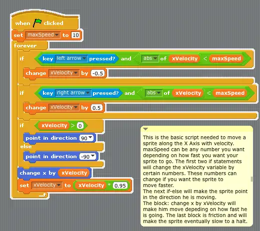 Text of the comment block (if you couldn't read it): This is the basic script needed to move a sprite along the X Axis with velocity. maxSpeed can be any number you want depending on how fast you want your sprite to go. The first two if statements will change the xVelocity variable by certain numbers. These numbers can change if you want the sprite to move faster. The next if-else will make the sprite point in the direction he is moving. The block: change x by xVelocity will make him move depeding on how fast he is going. The last block is friction and will make the sprite eventually slow to a halt
