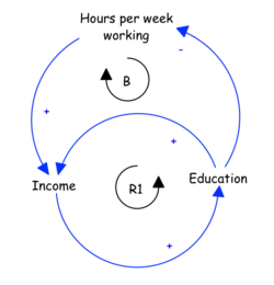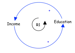 - For example, as education increases, income increases, and as income increases, there are more opportunities for even more education. This represents a reinforcing loop because the direction of change is reinforced. This same loop can either be a virtuous cycle or vicious cycle. For example, if I lose my job and income decreases, it may limit my ability to get an education, which in turn may make it even hard to get a job or future promotion, and this in turn would lower my income (draw the CLD shown in Figure 1).