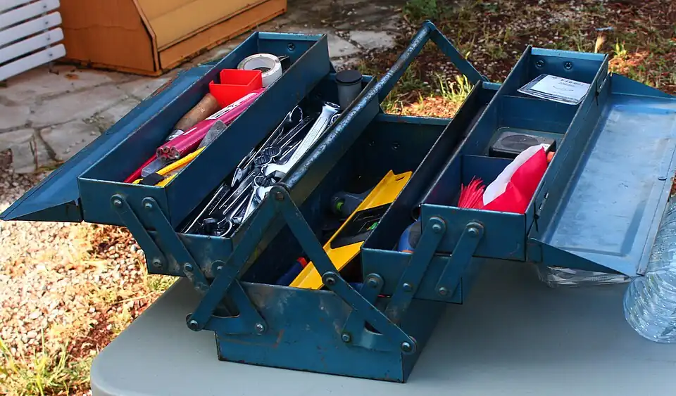 Manufactured or self-made toolboxes often have one more more drawers, removable/sliding trays, or smaller containers/dividers for small items (Figure 5.5-2). That makes it easier to organize and find what you need than a random pile. Additional types of tool carriers include large buckets, with optional tool organizers, non-rigid carrying bags and backpacks, and tool belts and aprons for when you want to keep some tools at hand.