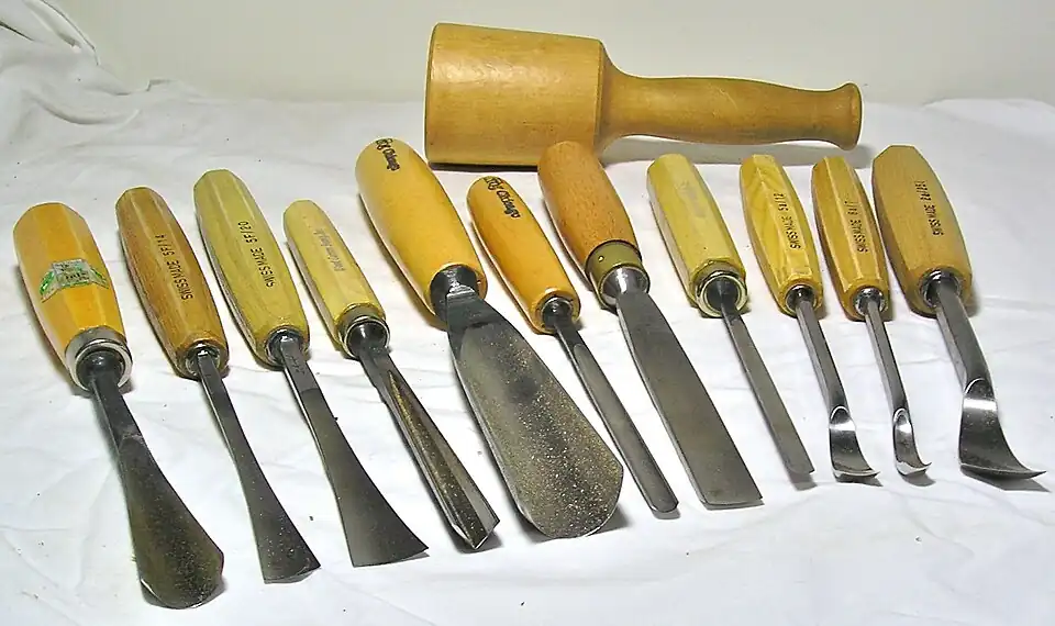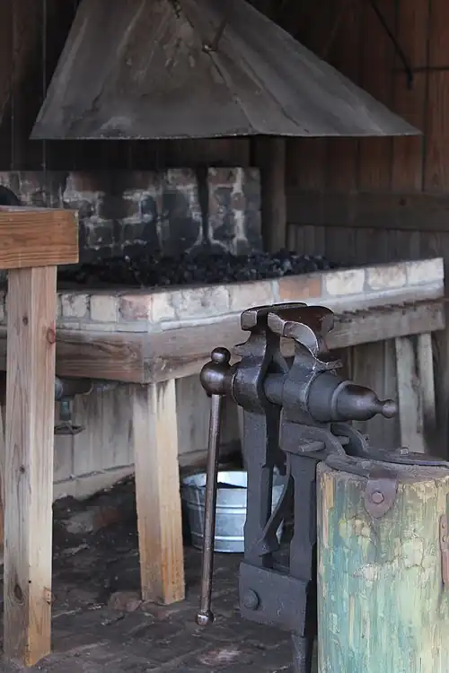 Simple self-made woodworking projects include saw benches and saw horses, a stationary workbench, bench hook, miter box, and wooden mallets. A blacksmith can make many of their own tools, including a forge, chisels, hammers, punches, drifts, and fullers. A skilled one can make tongs, specialized hammers, hardies, flatters, and swages. Combining wood and iron work can produce cutting tools like axes and chisels, planes, drawknives, spokeshaves, claw hammers, and screwdrivers. David Gingery even wrote a book series on how to build metalworking machines from scrap. At a more advanced level, a well-equipped machine shop can make many of the parts for another machine shop.