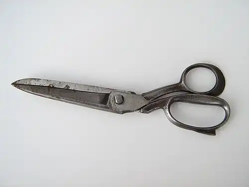 - Scissors/Shears - These have two sharpened blades on a pivot connected to handles. A toolbox version should have stronger blades and higher handle-to-blade length ratio to cut thicker material than household/craft scissors. A suitable heavy duty one is a Carpet Shears (Figure 5.5-6). The offset handles make it easier to cut on a flat surface.