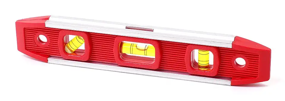 - Levels and Plumbs - For finding horizontal and vertical lines. Spirit levels have liquid with an air bubble in a curved tube. Start with a torpedo Level (Figure 5.5-5), a small magnetized one suitable for general home use, like leveling appliances. A Plumb Bob is a light string with a substantial weight, usually pointed at the bottom. Gravity pulls it vertical. It can be used to transfer positions or align objects vertically. If attached to a marked frame or scale it can help align vertical, horizontal or sloped directions.