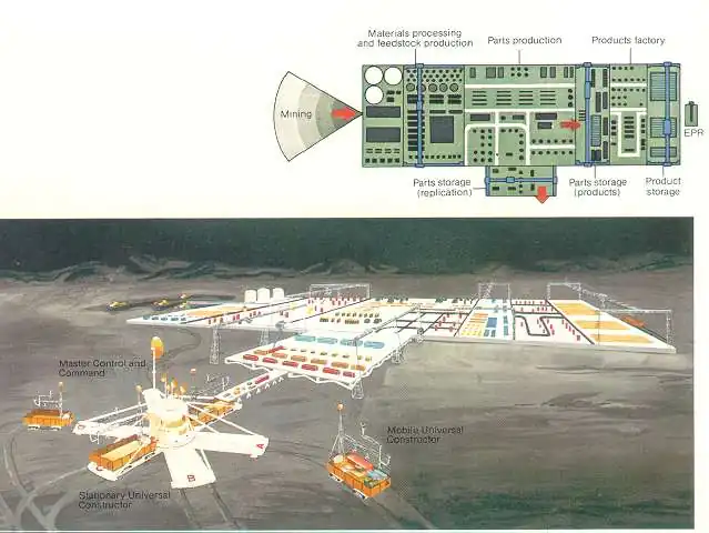 A 1982 NASA study report, Advanced Automation for Space Missions (AASM), introduced the concept of a replicating factory for use on the Moon (Figure 2.2-1). Their idea was to copy the original factory multiple times, using local materials and energy. Once enough copies had been made, the combined production capacity would turn to making an unspecified end product to support NASA goals. The AASM study introduced the term Seed Factory to mean the first unit of the factory delivered from Earth. In these books we use it for the more general concept of a starter set which can expand by multiple methods besides directly copying its own parts.
