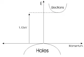 The total energy of an electron is given by its momentum and its potential energy. To move an electron from the conduction band to the valence band, it may need to undergo a change in potential energy and a change in momentum. There are two basic material types, in-direct and direct band gap materials. In an indirect band gap material, such as silicon, shown in figure 4, to move into the valence band, the electron must undergo a change in momentum and energy[1]. The chance of this event is small. Typically this process is achieved in several steps. The electron will first move to a trap site in the forbidden band before moving into the valence band. A change in potential energy will result in the release of a photon, while a change in momentum will produce a phonon (a phonon being a mechanical vibration which heats the crystal lattice).