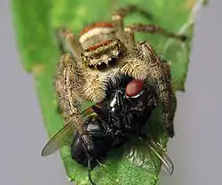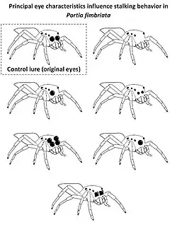 The resulting visual performance is impressive: Jumping spiders such as Portia focus accurately on an object at distances between 2 centimeters to infinity, being able to see up to about 75 centimeters in practice. The time needed to recognize objects is however relatively long (seemingly in the range of 10-20 s) because of the complex scanning process needed to capture high-quality images from such tiny eyes. Due to this limitation, it is very difficult for spiders such as Portia to identify much larger predators fast enough because of the predator´s size, making the small spider an easy prey for birds, frogs and other predators.[5][6]
