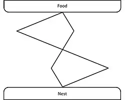 The ability to quickly find the shortest path to ephemeral food sources is a key survival factor for ants. When placed in an environment where the nest and a food source are connected by two paths of different length ants become increasingly biased towards the shorter path. In the beginning ants choose randomly between the two available paths, but ants that chose the shorter one are able to make the trip several times, thus leaving more chemoattractants on their path. The higher pheromone concentration will induce more ants to select the short path, thereby reinforcing the bias with every journey. This shows that a complex navigation problem can be solved by the colony-scale behavior emerging in a system with a single, positively valenced pheromone. [2]