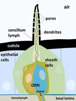The sensory neurons are located on silia, hair-like structures on the antennae. Within those structures are the sensilium filters (also referred to as sensilia), a cuticular apparatus that contains a group of sensory neurons and their auxiliary cells. Each antennomer contains a few different types of sensilia and secretory gland cells and can be observed with scanning electron microscopy. The types of sensilia differ not only between ant species but are also specific to the gender and caste of the ant in question. Different types and functions of sensilia Based on the morphological features of the sensilia (for instance, the presence or absence of pores), one can speculate on their functions and how they serve a specific sensory modality. There are seven different types of sensilia each with their own types of inputs: [3]