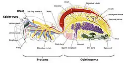 A spider´s anatomy primarily consists of two major body segments, the prosoma and the opisthosoma, which are also known as the cephalothorax and abdomen, respectively. All extremities as well as the sensory organs including the eyes are located in the prosoma. Other than the visual system of arthropods featuring compound eyes, modern arachnid eyes are ocelli (simple eyes consisting of a lens covering a vitreous fluid-filled pit with a retina at the bottom), of which spiders have six or eight, characteristically arranged in three or four rows across the prosoma´s carapace. Overall, 99% of all spiders have eight eyes and of the remaining 1% almost all have six. Spiders with only six eyes lack the “principal eyes”, which are described in detail below.