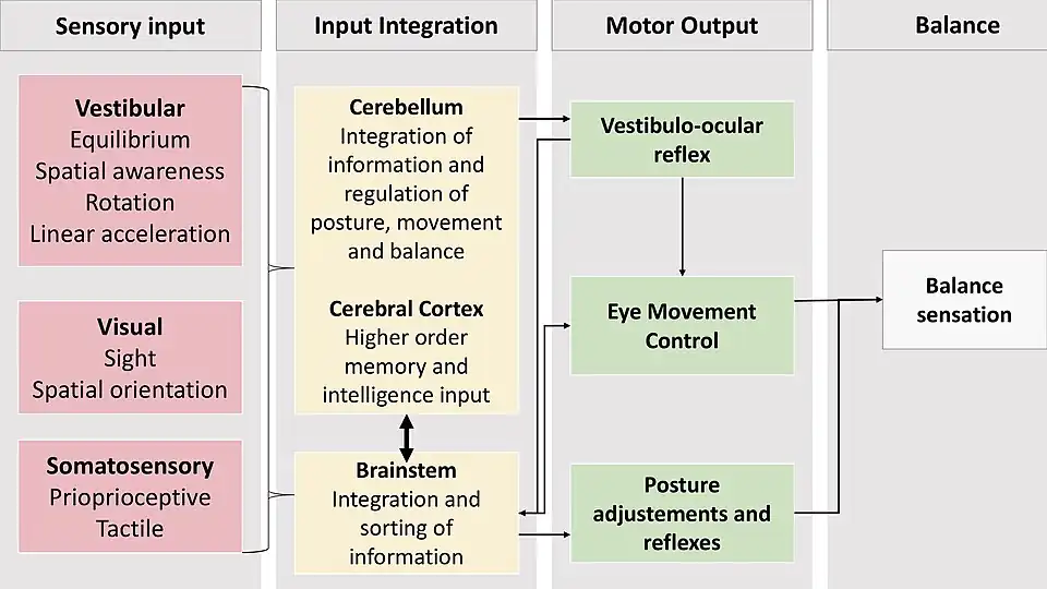 At the level of integration, the cerebellum is responsible for the coordination of motor behavior and is not accessible by our consciousness. It is, however, strongly influenced by the cerebral cortex, the projections of which make up the largest stream of inputs to the cerebellum.[3] Additionally, the brainstem is another important relay point for incoming and outgoing sensory information from all three inputs to the balance system. Its role is mostly to sort the incoming information and to enable the cerebellum to respond most efficiently to the current situation.