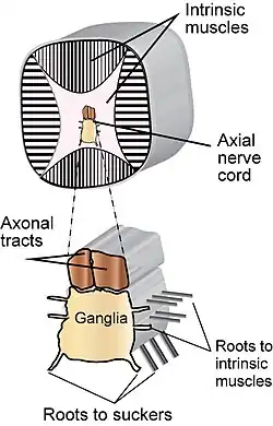 Cross section of an octopus arm: The lateral roots innervate the intrinsic muscles, the ventral roots the suckers.