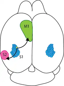 The sensory neurons make excitatory glutamatergic synapses in the trigeminal nuclei of the brain stem. Trigemino-thalamic neurons in the principal trigeminal nucleus are organized into somatotopically arranged ‘‘barrelettes,’’ each receiving strong input from a single whisker as shown in (Figure 3). The principal trigeminal neurons project to the ventral posterior medial (VPM) nucleus of the thalamus, which is also somatotopically laid out into anatomical units termed ‘‘barreloids’’ VPM neurons respond rapidly and precisely to whisker deflection, with one ‘‘principal’’ whisker evoking stronger responses than all others. The axons of VPM neurons within individual barreloids project to the primary somatosensory neocortex forming discrete clusters in layer 4, which form the basis of the ‘‘barrel’’ map as shown in Figure 3.