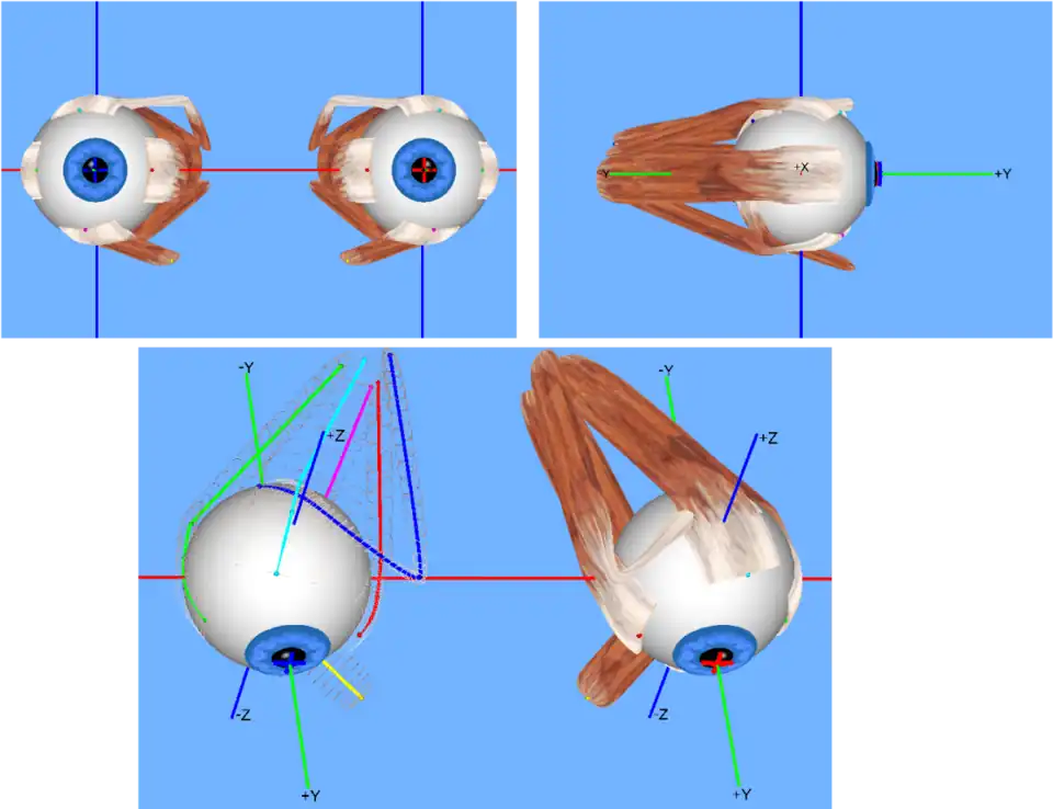 As you can see, the extra-ocular muscles (2,3,4,5,6,8) are attached to the sclera of the eyeball and originate in the annulus of Zinn, a fibrous tendon surrounding the optic nerve. A pulley system is created with the trochlea acting as a pulley and the superior oblique muscle as the rope, this is required to redirect the muscle force in the correct way. The remaining extra-ocular muscles have a direct path to the eye and therefore do not form these pulley systems. Using these extra-ocular muscles, the eye can rotate up, down, left, right and alternative movements are possible as a combination of these.