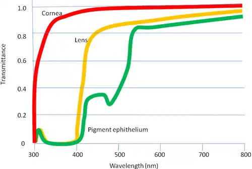 Before being transduced, incoming EM passes through the cornea, lens and the macula. These structures also act as filters to reduce unwanted EM, thereby protecting the eye from harmful radiation. The filtering response of each of these elements can be seen in the figure "Filtering of the light performed by cornea, lens and pigment epithelium". As one may observe, the cornea attenuates the lower wavelengths, leaving the higher wavelengths nearly untouched. The lens blocks around 25% of the EM below 400nm and more than 50% below 430nm. Finally, the pigment ephithelium, the last stage of filtering before the photo-reception, affects around 30% of the EM between 430nm and 500nm.