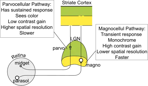 - ↑ Livingstone, Margaret S and Hubel, David H (1987). "Psychophysical evidence for separate channels for the perception of form, color, movement, and depth". The Journal of Neuroscience. 7 (11): 3416–3468.