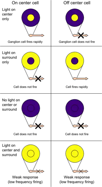 When the action potential (AP) in ON, ganglion cells will be triggered by the visible EM stimulus. The AP frequency will increase when the sensor potential increases. In other words, AP depends on the amplitude of the sensor's potential. The region of ganglion cells where the stimulatory and inhibitory effects influence the AP frequency is called receptive field (RF). Around the ganglion cells, the RF is usually composed of two regions: the central zone and the ring-like peripheral zone. They are distinguishable during visible EM adaptation. A visible EM stimulation on the centric zone could lead to AP frequency increase and the stimulation on the periphery zone will decrease the AP frequency. When the light source is turned off the excitation occurs. So the name of ON field (central field ON) refers to this kind of region. Of course the RF of the OFF ganglion cells act the opposite way and is therefore called "OFF field" (central field OFF). The RFs are organised by the horizontal cells. The impulse on the periphery region will be impulsed and transmitted to the central region, and there the so-called stimulus contrast is formed. This function will make the dark seem darker and the light brighter. If the whole RF is exposed to light. the impulse of the central region will predominate.