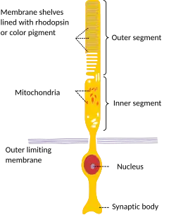 Rods have a structure similar to cones, however they contain the pigment rhodopsin instead, which allows them to detect low-intensity light and makes them 100 times more sensitive than cones. Rhodopsin is the only pigment found in human rods, and it is found on the outer side of the pigment epithelium, which similarly to cones maximizes absorption area by employing a disk structure. Similarly to cones, the synaptic terminal of the cell joins it with a bipolar cell and the inner and outer segments are connected by cilium.