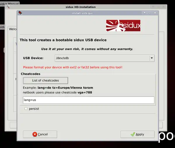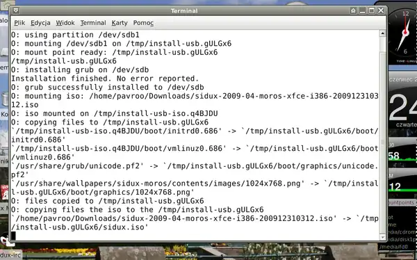 - 3. Run the installator: Menu-> System-> install-sidux-to-usb and click on: Apply.