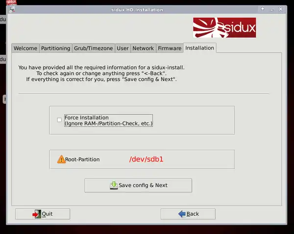- sidux-on-a-stick full installation looks similar like hard drive installation.