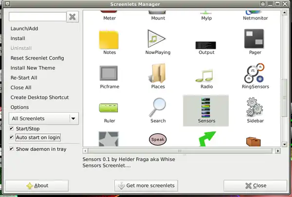 - b. To get more applets click on: Get more screenlets and download theme, extract and move to folder:
