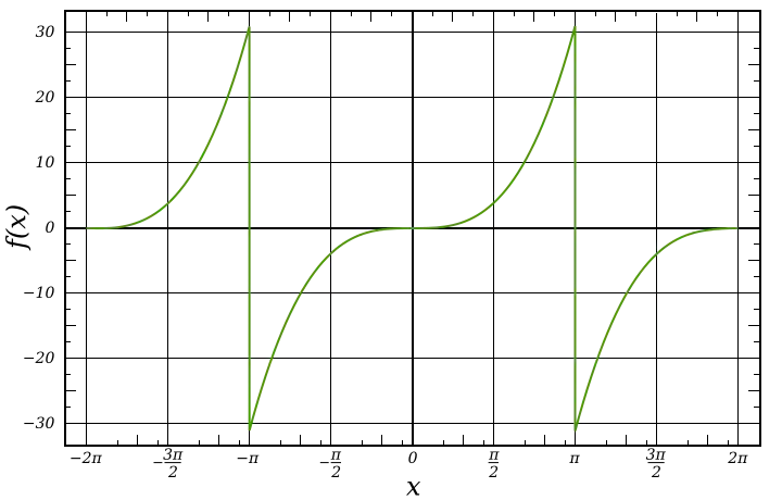 The graph below shows the approximation for the first 7 terms (red) and the first 15 terms (blue). The original function is shown in black.