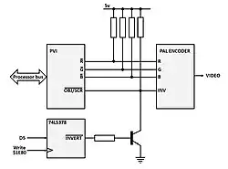 The sync generator passes this to the 2636 PVI as a pixel (or position) clock, and divides it by four to clock the microprocessor at 887 kHz. It also generates the vertical and horizontal reset signals for the PVI, as well as composite video timing signals for the video encoder.