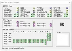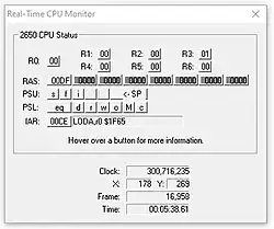 - X and Y coordinates currently being output to the screen (negative values of X mean the horizontal blanking period), registers R4, R5, R6 (the second bank of R1, R2, R3) and PSL