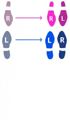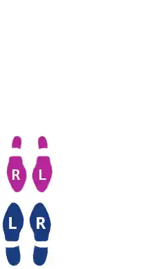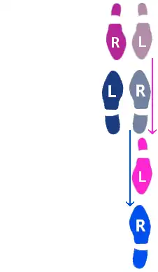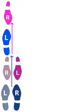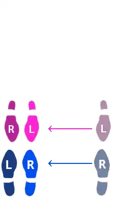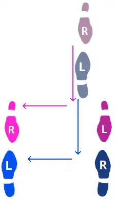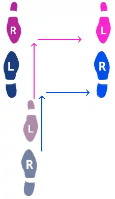 | Step 2. Lead brings the right foot forward and then to the right, while Follow brings left foot back and to the left. This occurs for the third count. This is the first quick in the slow--quick-quick pattern. |