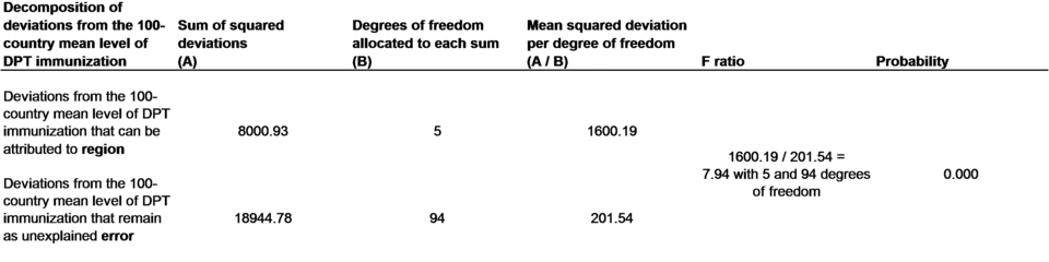 In the traditional ANOVA model, the deviations of the regional means from the overall mean are all squared and summed up into a sum of squared deviations. The remaining deviations of the countries from their regional means are also squared and summed up. Then the two sums are compared to determine whether or not the deviations due to region make up a statistically significant proportion of the total squared deviations. This process is summarized in Figure 10-10 for the DPT data. The sum of squared deviations for the regions is 8000.93, while the sum of squared error deviations is 18944.78. Each sum of squared deviations is then divided by its degrees of freedom. Since the six regions can be fully described using five ANOVA variables, region overall (as a categorical variable) only has five degrees of freedom. As with the t statistic (Chapter 6), estimating the mean also takes up one degree of freedom. Since there are 100 cases, this means that there are 100 - 5 - 1 = 94 degrees of freedom left over for model error.