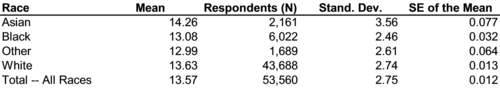 10.5. Case study: Racial differences in education in the United States Americans of difference races have always faced different educational opportunities. Before the 1960s, many schools and universities were entirely closed to black students, and some schools and universities also discriminated against students of Asian and other racial backgrounds. In addition to outright discrimination by schools, people of different races also faced a range of educational barriers based on income, location, awareness of opportunities, and many other factors. Figure 10-11 reports the racial differences in education among American adults age 30 and over among participants in the 2008 Survey of Income and Program Participation (SIPP), Wave 2. The focus is on people aged 30 and over because most people have finished their education by age 30.